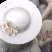 Figuras decorativas. España. Siglo XX. Elaboradas en porcelana Lladró, acabado brillante. Diferentes diseños y tamaños. Consta de: dama esquiva, dama añorante y muchacha con pamela airosa. Presentan detalles de conservación, manchas y faltantes. Dimensiones: 21 cm. (mayor). Piezas: 3 Estimado $ 2,500-3,500