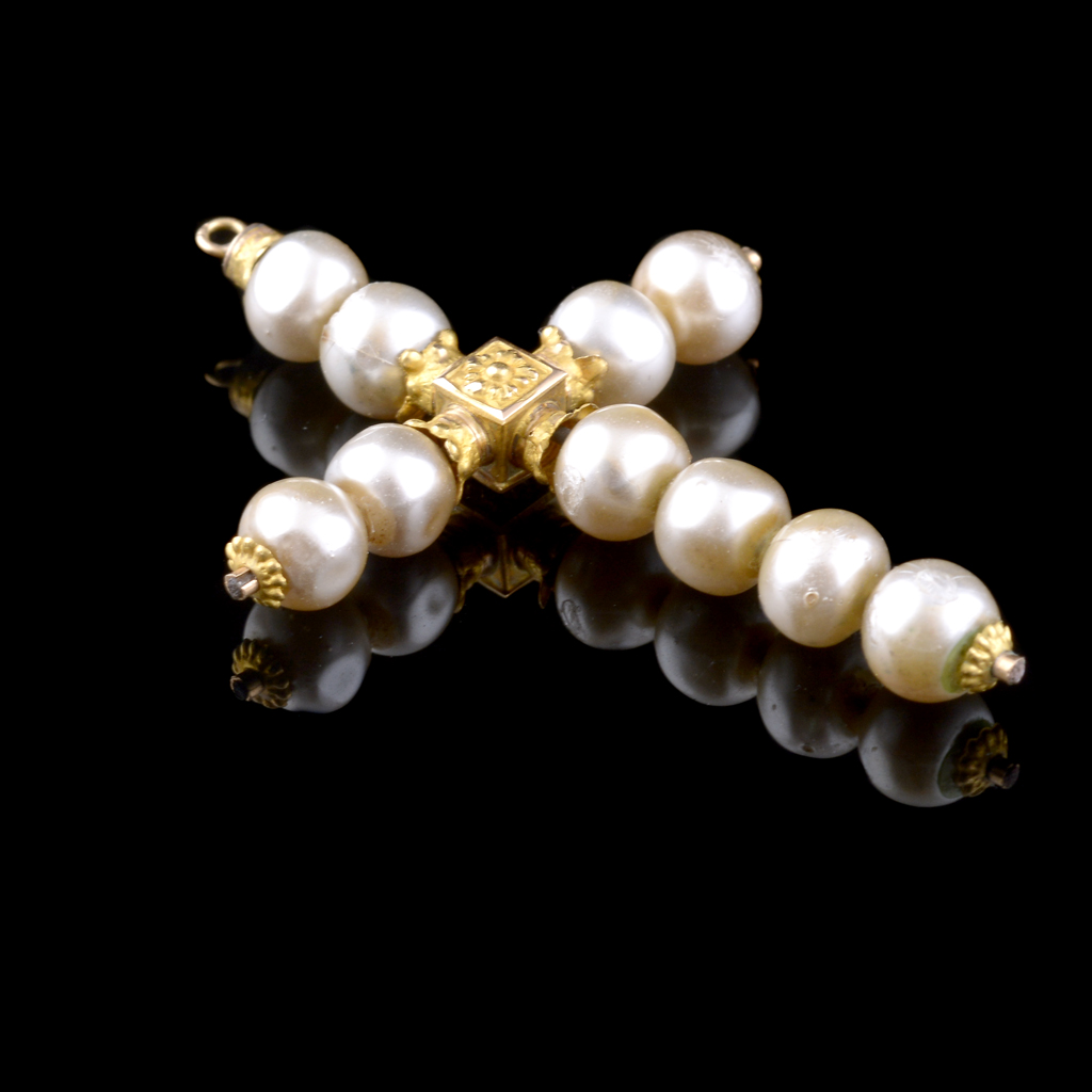 Cruz antigua. Elaborada en oro amarillo de 22k. repujado (remates en metal base). Con perlas de imitación. Dimensiones: 3.4 x 4.8 mm. (pasa cadena incluido). Muestra marcas de uso y fisuras. Peso: 1.8 g. Estimado $ 1,500-2,500