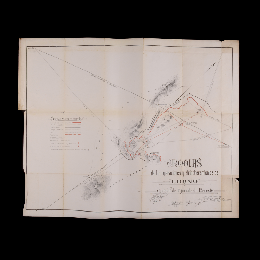 Croquis de Operaciones Militares del Cuerpo del Ejército de Oriente. Consta de: a) Croquis de las Operaciones para la Toma de la Ciudad de México. Con firmas impresas del Cuerpo del Ejército de Oriente. Dimensiones: 38 x 63 cm. b) Croquis de las Operaciones y Atrincheramientos de "Ebano". Con firmas impresas de los cuerpos del Ejército de Noreste. Dimensiones: 48 x 60 cm. Sin enmarcar. Presentan detalles de conservación, manchas y rasgaduras. Piezas: 2 *La toma de la Ciudad de México por el Cuerpo del Ejército de Oriente, al mando de Pablo González Garza, fue el 2 de agosto de 1915. La batalla del Ébano tuvo lugar el 21 de marzo al 31 de mayo de 1915, entre las tropas constitucionalistas (carrancistas) al mando del general Jacinto B. Treviño y los convencionalistas (villistas) al mando del general Tomás Urbina.* Estimado $ 2,000-4,000