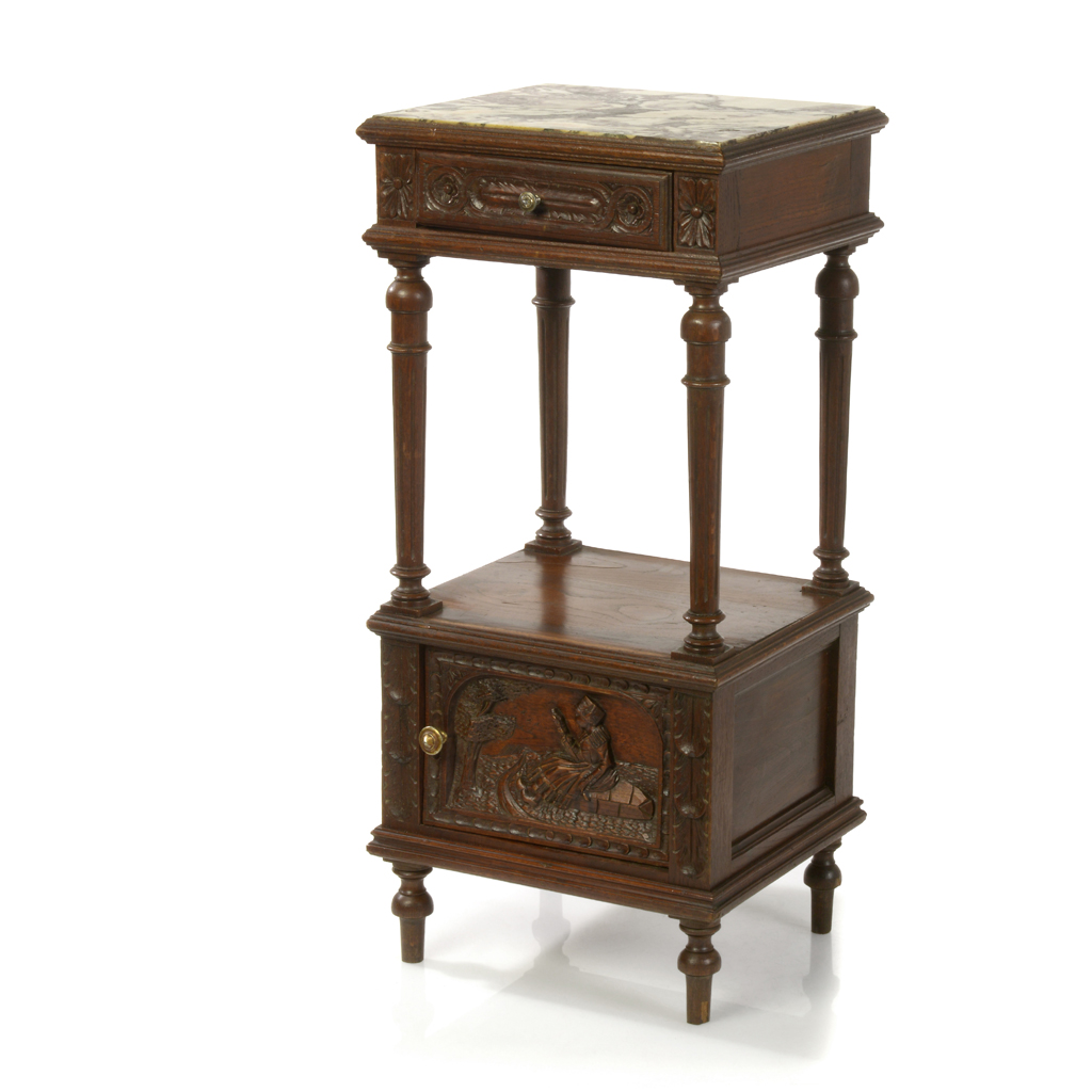 Mesa de noche. Francia. Siglo XX. Estilo Bretón. Elaborada en madera tallada de roble. A 2 niveles. Con cubierta de mármol veteado, puerta inferior, cajón superior y soportes tipo bollo. Decorada con escena campirana, rosetones y motivos vegetales. Presenta detalles de conservación, de estructura, ligeras fisuras, marcas y desgaste. Dimensiones: 87 x 41 x 36 cm. Estimado $ 4,000-6,000