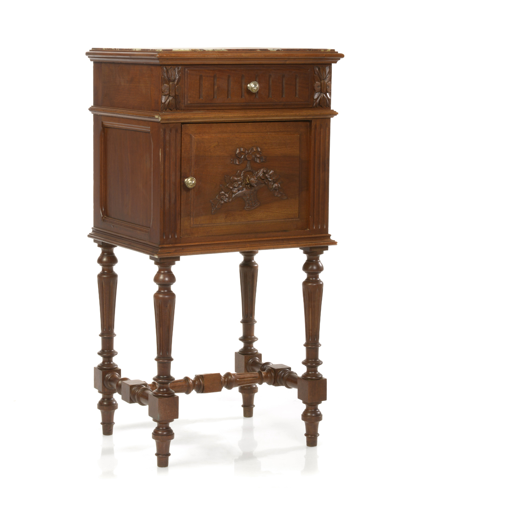 Mesa de noche. Francia. Siglo XX. Estilo Enrique II. Elaborada en madera tallada de nogal. Con cubierta de mármol veteado, puerta, cajón, travesaño inferior y soportes compuestos. Decorada con cesta de flores y motivos estriados. Presenta detalles de conservación, despostillado, fisuras, marcas y desgaste. Dimensiones: 85 x 43 x 35 cm. Estimado $ 3,000-5,000