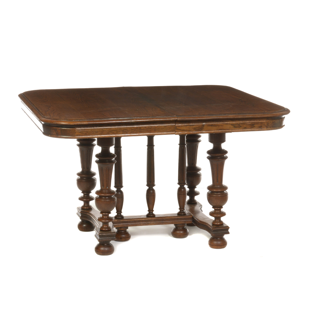 Mesa. Francia. Siglo XX. Estilo Enrique II. Elaborada en madera tallada de roble. Con cubierta rectangular, soportes tipo bollo y sistema para extensiones. Decorada con barandilla y columnas compuestas. Presenta detalles de conservación, de estructura, fisuras, marcas y desgaste. Dimensiones: 67 x 112 x 102 cm. Estimado $ 5,000-7,000