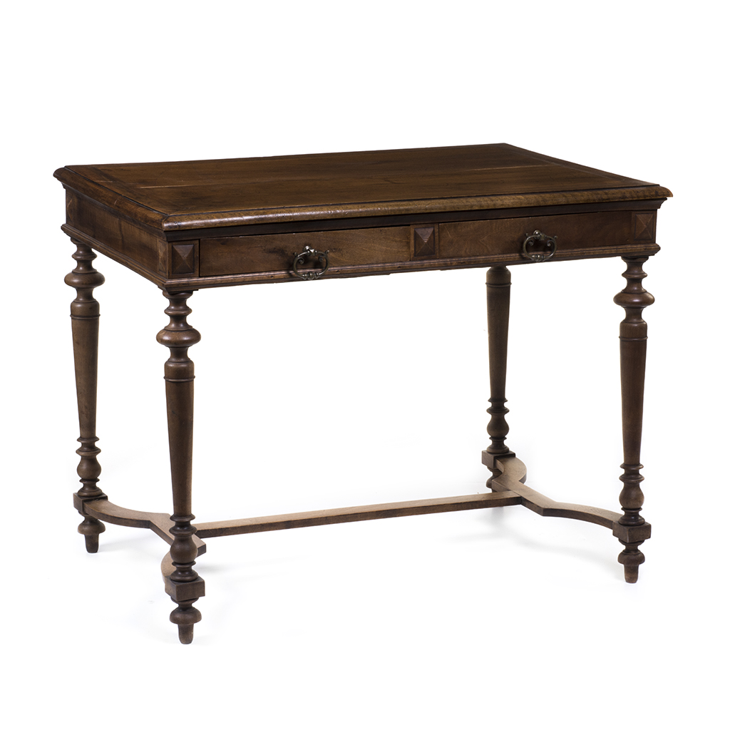 Escritorio. Francia. Siglo XX. Elaborado en madera tallada de nogal. Con 2 cajones, chambrana en "H" y soportes compuestos. Presenta detalles de conservación, de estructura, apolillado, fisuras, marcas y desgaste. Dimensiones: 76 x 98 x 63.5 cm. Estimado $ 3,000-5,000