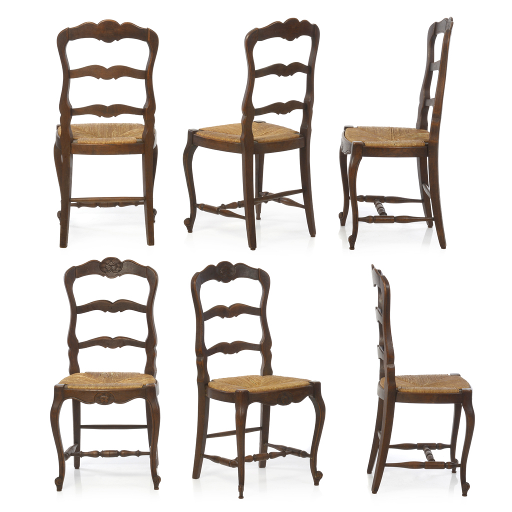 Juego de sillas. Francia. Siglo XX. Estilo Luis XV. Elaboradas en madera tallada de roble. Respaldos con travesaños, asientos de palma tejida, chambrana en "H" y soportes tipo cabriolé. Decoradas con veneras. Presentan detalles de conservación, fisuras, marcas y desgaste. Piezas: 6 Estimado $ 5,000-7,000
