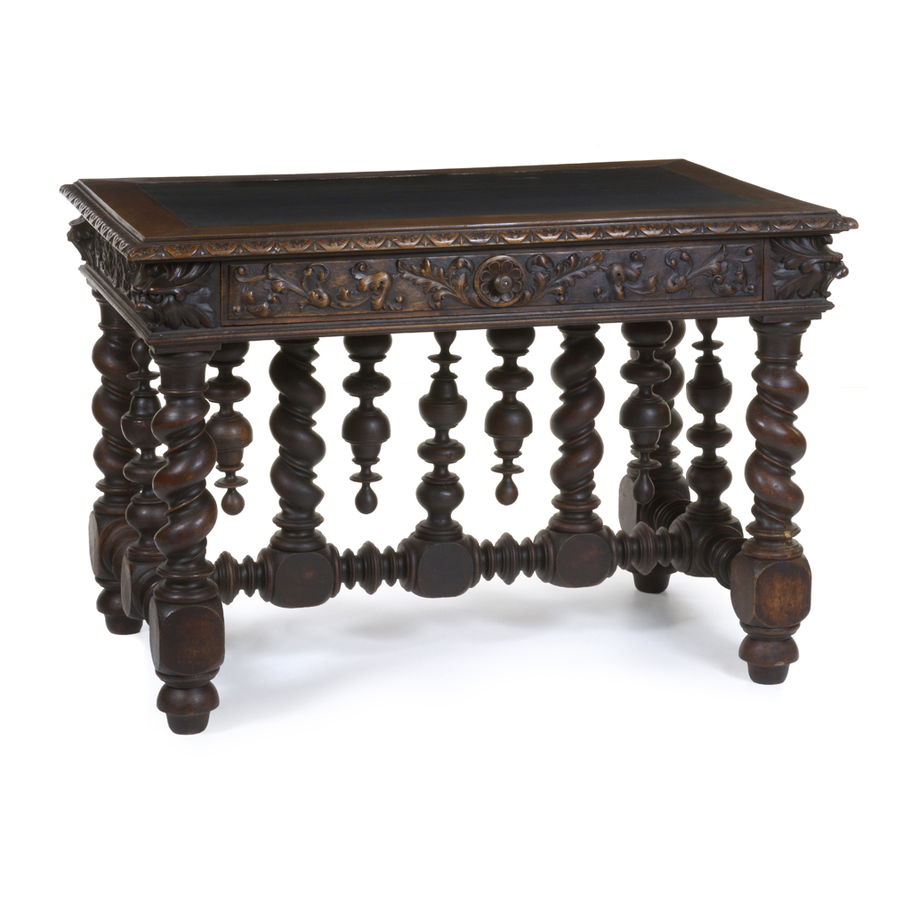 Decorado con rosetones, guías vegetales, mascarones híbridos, pináculos, y columnas torzales.