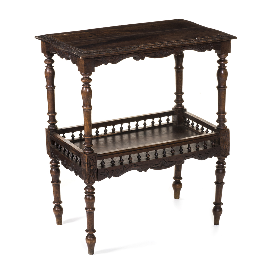 Mesa auxiliar. Francia. Siglo XX. Estilo Bretón. Elaborada en madera tallada de roble. A 2 niveles. Con cubiertas rectangulares y soportes tipo carrete. Decorada con barandillas, acantos y cenefas vegetales. Presenta detalles de conservación, fisuras, marcas y desgaste. Dimensiones: 75 x 63 x 38.5 cm. Estimado $ 3,000-5,000