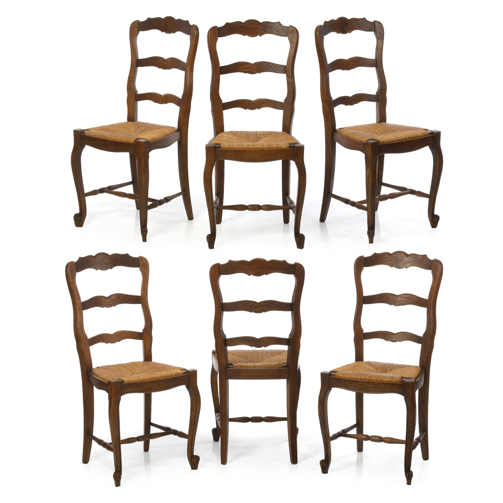Juego de sillas. Francia. Siglo XX. Estilo Luis XV. Elaboradas en madera tallada de roble. Respaldos con travesaños, asientos de palma tejida, chambrana en "H" y soportes tipo cabriolé. Presentan detalles de conservación, marcas y desgaste. Piezas: 6 Estimado $ 5,000-7,000