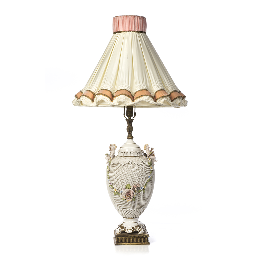 Lámpara de mesa. Italia. Siglo XX. Elaborada en porcelana Capodimonte. Para 1 luz. Diseño a manera de jarrón. Con pantalla de tela satinada color beige. Decorada con niños, festones florales, vides, hojas de parra y acantos. Sobre base cuadrangular de madera dorada. Presenta restauraciones, fisuras y ligeros despostillados. Dimensiones: 109 cm. Estimado $ 3,500-4,500