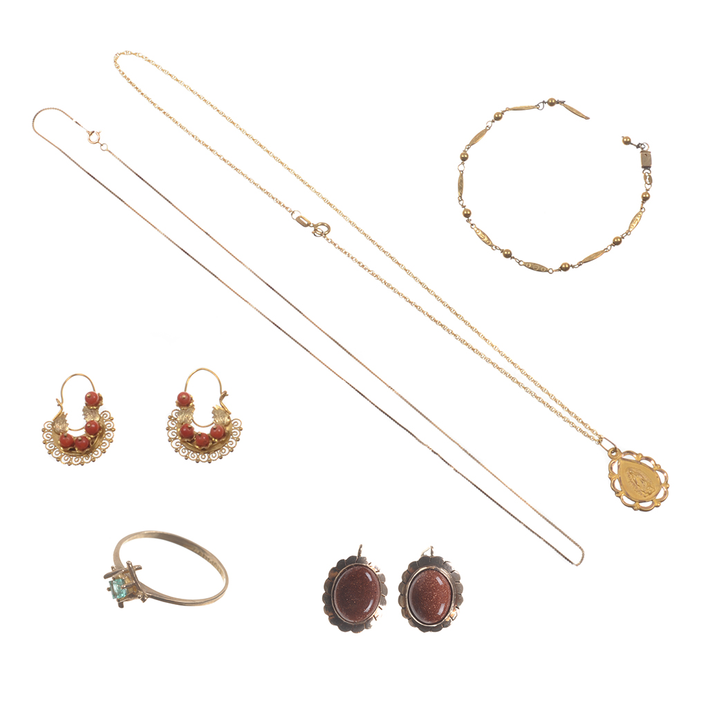 Lote de joyería. Elaborada en oro amarillo de 18k, 10k. y 8k. Consta de: 2 collares, medalla, anillo, par de aretes, pulsera y par de arracadas. Muestra pulsera reventada. Medida aproximada: 5 1/2 Peso: 15.7 g. Piezas: 7 Estimado $ 3,500-4,500