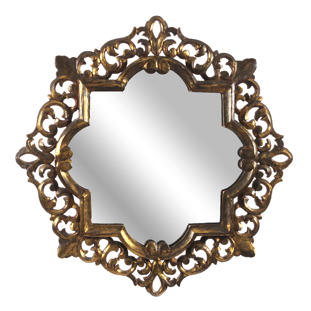 Espejo. Siglo XX. Marco de madera con hoja de oro. Diseño calado, vegetal y octagonal. Con luna irregular. Presenta manchas y ligeros desprendimientos. Dimensiones: 68 x 68 cm. Estimado $ 2,000-3,000