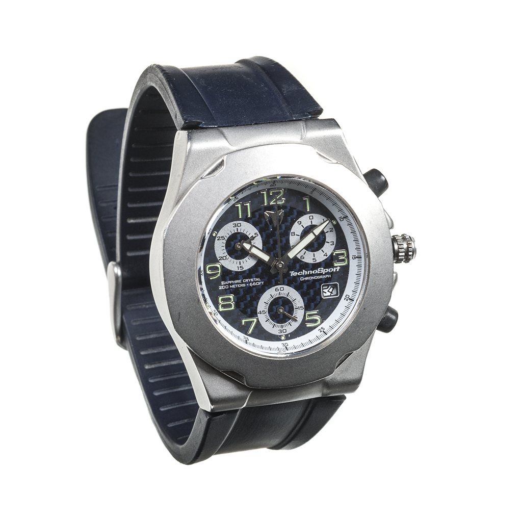 Subasta 898T, Lote # 201 Reloj. Technomarine. Movimiento de cuarzo. Caja circular en acero y carátula negra con 3 esferas. Pulso en caucho. Funcional. Estimado $ 3,500-5,000