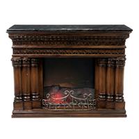 Chimenea eléctrica. Siglo XX. Elaborada en madera aglomerada. Con cubierta de mármol veteado verde, frontal de vidrio y leña de resina con sistema de iluminación. Decorada con cenefas vegetales y florales, columnas triples con capiteles corintios y frontal de metal a manera de roleos. Presenta marcas y desprendimientos. Dimensiones: 92.5 x 119.5 x 38 cm. Estimado $ 10,000-15,000