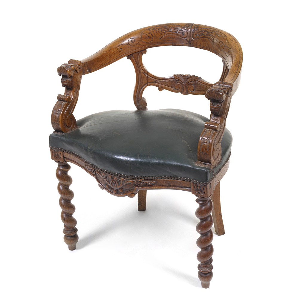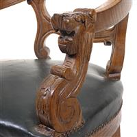 Sillón. Francia. Siglo XX. Elaborado en madera tallada. Diseño curvo. Con respaldo abierto, asiento en piel verde y soportes torzales. Decorado con roleos, acantos y seres fantásticos. Presenta apolillado, fisuras, tapicería perforada y desgaste. Estimado $ 2,500-3,500