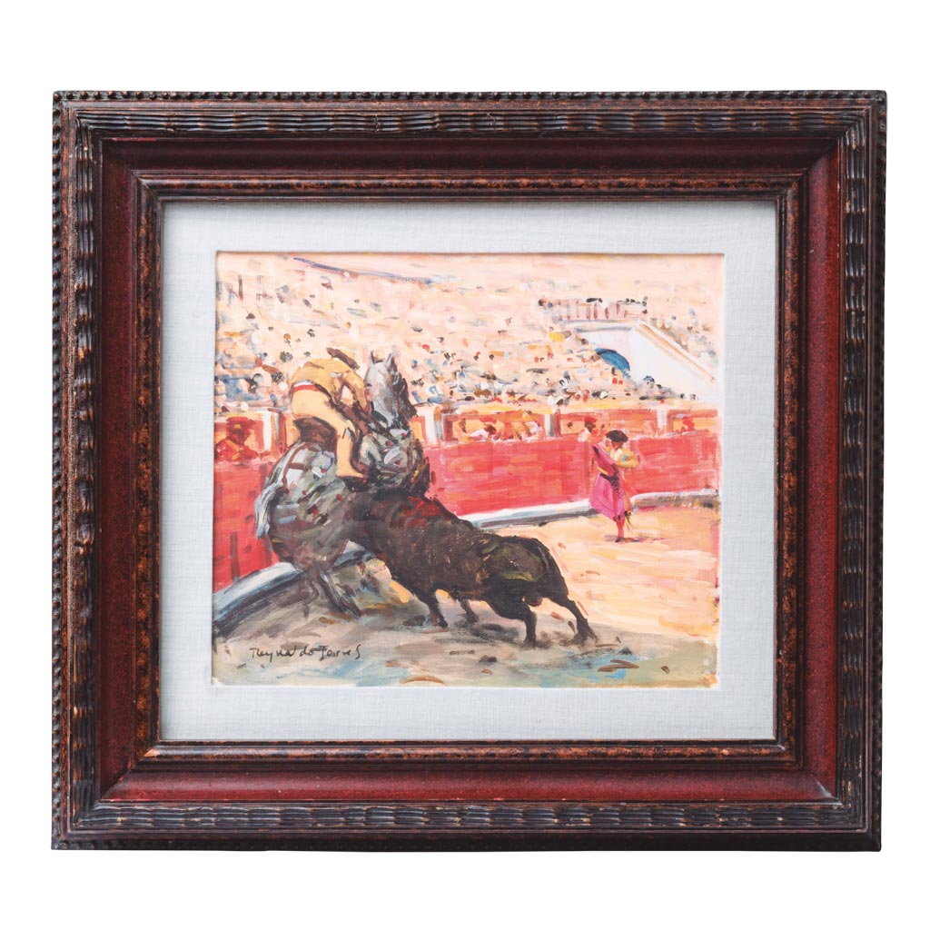 Subasta 880, Lote # 334 Reynaldo Torres. México, siglo XX. Rejoneador con toro. Óleo sobre cartoncillo. Firmado. Detalles de conservación. 35 x 30 cm Estimado $8,000-12,000