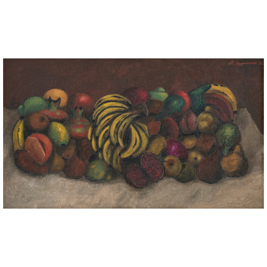 Subasta 867, Lote # 58 MARÍA IZQUIERDO (San Juan de los Lagos, Jalisco, 1902 - Ciudad de México, 1955) Naturaleza muerta Firmado y fechado 32 Óleo sobre tela Con etiquetas del Museo Nacional de Arte, Museo Contemporáneo de Monterrey y Centro Cultural Arte Contemporáneo. Publicado en: LITTMAN, Robert R. et ál. María Izquierdo. México. Fundación Televisa, 1988, Pág. 128. CORZO, Miguel Ángel et ál. Passione per la vita. Italia. Elemond Editori Associati, 1997, pp. 106 y 212. LOZANO, Luis-Martín. María Izquierdo: Una verdadera pasión por el color. México, Landucci Editores, 2002, pp. 74 y 76. ZAVALA, Adriana. Un arte nuevo: El aporte de María Izquierdo. México. UNAM, 2008, pp. 33 y 34. Exhibido en: -"María Izquierdo 1902-1955", en el Centro Cultural de Arte Contemporáneo de Fundación Televisa, de noviembre de 1988 a febrero de 1989. -"Passione per la vita", en Castel dell´Ovo en Italia, de marzo a junio de 1997. -"MUNAL 2000", en el Museo Nacional de Arte MUNAL, junio del 2000. -"Museo del imaginario en el MUNAL" en el Museo Nacional de Arte MUNAL, en 2001. -"Una verdadera pasión por el color del Centenario Natalicio María Izquierdo", en el Instituto Cultural Cabañas, de diciembre del 2002 a febrero del 2003 y en Palacio de Bellas Artes, de marzo a mayo del 2003. -"Arte Nuevo. El aporte de María Izquierdo", en el Centro Cultural Universitario Tlatelolco, de octubre del 2007 a abril del 2008 y en Museo de Arte Contemporáneo de Monterrey, MARCO, de abril a agosto del 2008. Asistió a la Academia de San Carlos, estudió con Manuel Toussaint, Germán Gedovius y Rufino Tamayo con quien compartió estudio por un periodo y mantuvo una relación sentimental. Asistió a las escuelas de pintura al aire libre. Fue una artista representante del periodo posrevolucionario y de vanguardia. Mantuvo una postura y perspectiva feminista, se preocupó por representar problemáticas de género, apartándose de estereotipos nacionalistas como la Madre Patria, las mujeres indígenas y elementos anecdóticos o costumbristas. Por su lado representó en sus lienzos estados emocionales como el dolor, la melancolía y la angustia. En este sentido coordinó la exposición "Carteles Revolucionarios Femeninos" para Bellas Artes en 1935 y fue integrante de la Liga de Escritores y Artistas Revolucionarias. Los bodegones son parte de su iconografía, sin embargo fue una artista polifacética que plasmó en sus obras escenas circences, retratos de personajes cercanos a su época y círculos íntimos, así como otras imágenes que poseen aspectos oníricos del género surrealista. "Naturaleza muerta" es una de las obras que más se han exhibido de María Izquierdo, se presentó en el extinto Centro Cultural de Arte Contemporáneo de Fundación Televisa, en Castel dell"Ovo en Italia, en el MUNAL, en el Instituto Cultural Cabañas en Guadalajara, en el Palacio de Bellas Artes, en el Centro Cultural Universitario Tlatelolco y en el MARCO de Monterrey. "Por el color y por el repertorio de sus figuraciones María Izquierdo es una artista inconfundiblemente mexicana. Se afincó en estas singularidades gozosamente. Suyos eran los volcanes, suyo era el trópico, suyo era el mar o costa abrupta y la enervante aridez de la erosionada serranía". Raquel Tibol. Fuente consultada: SCHNEIDER, Luis Mario et ál. María Izquierdo. México. Casa del Bolsa Cremi, 1986, Pág. 52. María Izquierdo's work is considered National Heritage of Mexico, for this particular piece you can do an export procedure. In case of interest by foreign customers we beg to contact the Modern and Contemporary Art Department for more information. 44 x 75 cm USD $139,000-$160,500 Estimado $ 2,600,000-3,000,000