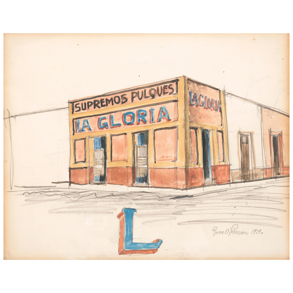 Subasta 867, Lote # 25 JUAN O'GORMAN (Ciudad de México, 1905 - Ciudad de México, 1982) Supremos pulques La gloria Firmada y fechada 1929 Acuarela sobre papel Procedencia: adquirida en Galería Lourdes Chumacero, perteneció a la colección privada del poeta mexicano Alí Chumacero. Con etiqueta de la Galería Lourdes Chumacero. De origen prehispánico, el pulque es una de las bebidas fermentadas más famosa en México, cuyo consumo ha sido toda una tradición y los locales que lo expenden se llaman pulquerías. Juan O'Gorman fue un destacado pintor, que por su profesión de arquitecto creó obras en la que destacó su técnica plástica constructiva. Fue entre 1921 y 1925, que estructuró su formación artística como arquitecto, laborando con Carlos Obregón y Carlos Tarditi; así mismo, por encargo de José Vasconselos, el entonces Secretario de Educación, trabajó en la realización de murales en tres pulquerías y en una cantina, contrato que estipulaba que se debían representar paisajes, personajes y motivos decorativos nacionalistas. En 1929, compró un terreno que correspondía a dos canchas de tenis en la zona de San Ángel en la Ciudad de México, en una parte construyó la primera casa funcional de estilo corbusiana, supuestamente para sus padres, quienes nunca la habitaron; la otra parte fue estructurada en1931, por encargo de Diego Rivera y Frida Kahlo para construir la casa habitación conocida como Museo Casa Estudio Diego Rivera y Frida Kahlo. Fuentes consultadas: VALLARINO, Roberto et ál. Juan O'Gorman. 100 años. Temples, dibujos y estudios preparatorios. México. Fomento Cultural Banamex, 2005, pp. 84 y 203 y ADRIÁ, Miguel. "Juan O'Gorman". México. Arquine, 22 de marzo del 2013. 20 x 25 cm USD $2,700-$3,800 Estimado $ 50,000-70,000