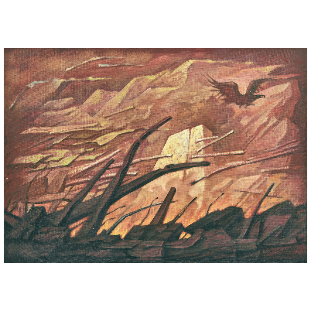 Subasta 867, Lote # 51 JORGE GONZÁLEZ CAMARENA (Guadalajara, Jalisco, 1908 - Ciudad de México, 1980) Viento de piedra Firmado al frente. Firmado y fechado V-1977 al reverso Óleo y acrílico sobre tela Con certificado de autenticidad de Jorge González Camarena Barre de Saint Leu. Publicado en: GONZÁLEZ CAMARENA, Jorge A. et ál. Evocaciones de Jorge González Camarena. México. Instituto Politécnico Nacional, 2016, pp. 97 y 98 y en CORONEL, Juan Rafael, et ál. Premio Nacional de Ciencias y Artes. 60 años de historia plástica. México. CONACULTA, 2005, Pág. 90, catalogado 22. Incluye ejemplar. Con etiqueta del Museo Palacio de Bellas Artes y Premio Nacional de Ciencias y Artes. Es uno de los representantes de la segunda generación de muralistas mexicanos. A corta edad ingresó a la Escuela Nacional de Bellas Artes y posteriormente fue ayudante de Gerardo Murillo, Dr. Atl, con quien trabajó de modo constante y fue asistente de las Escuelas al Aire Libre. Tuvo entusiasmo e interés en abordar temáticas de culturas precolombinas, aspectos relacionados con el movimiento revolucionario, históricos-sociales y de índole musical. El género del retrato ocupó parte importante de su quehacer artístico, en donde representó a personajes cercanos, además desarrolló su propio sistema de composición que denominó "cuadratismo". En su producción destacan los murales "Venustiano Carranza y la Constitución de 1917" en el Museo Nacional de Historia del Castillo de Chapultepec, realizó el mural "La humanidad se libera de la miseria", ubicado en el Palacio de Bellas Artes, al lado de los realizados por Diego Rivera, David Alfaro Siqueiros, Rufino Tamayo, Roberto Montenegro y Manuel Rodríguez Lozano. Pintó el imponente mural de trescientos metros cuadrados en la Universidad de Concepción, en Chile, que refleja el imaginario de los chilenos. "En conclusión, es una ciudad que el viento trata de llevarse, parece arder en llamas, y sin duda es una ciudad de la República Mexicana, ya que el águila es nuestro símbolo patrio, sin embargo, la vemos fatigada y desplumándose". Jorge González Camarena Barre de Saint Leu. Fuente consultada: GONZÁLEZ CAMARENA, Jorge A. et ál. Evocaciones de Jorge González Camarena. México. Instituto Politécnico Nacional, 2016, pp. 13 -16 y 97. 50 x 70 cm USD $50,800-$80,200 Estimado $ 950,000-1,500,000