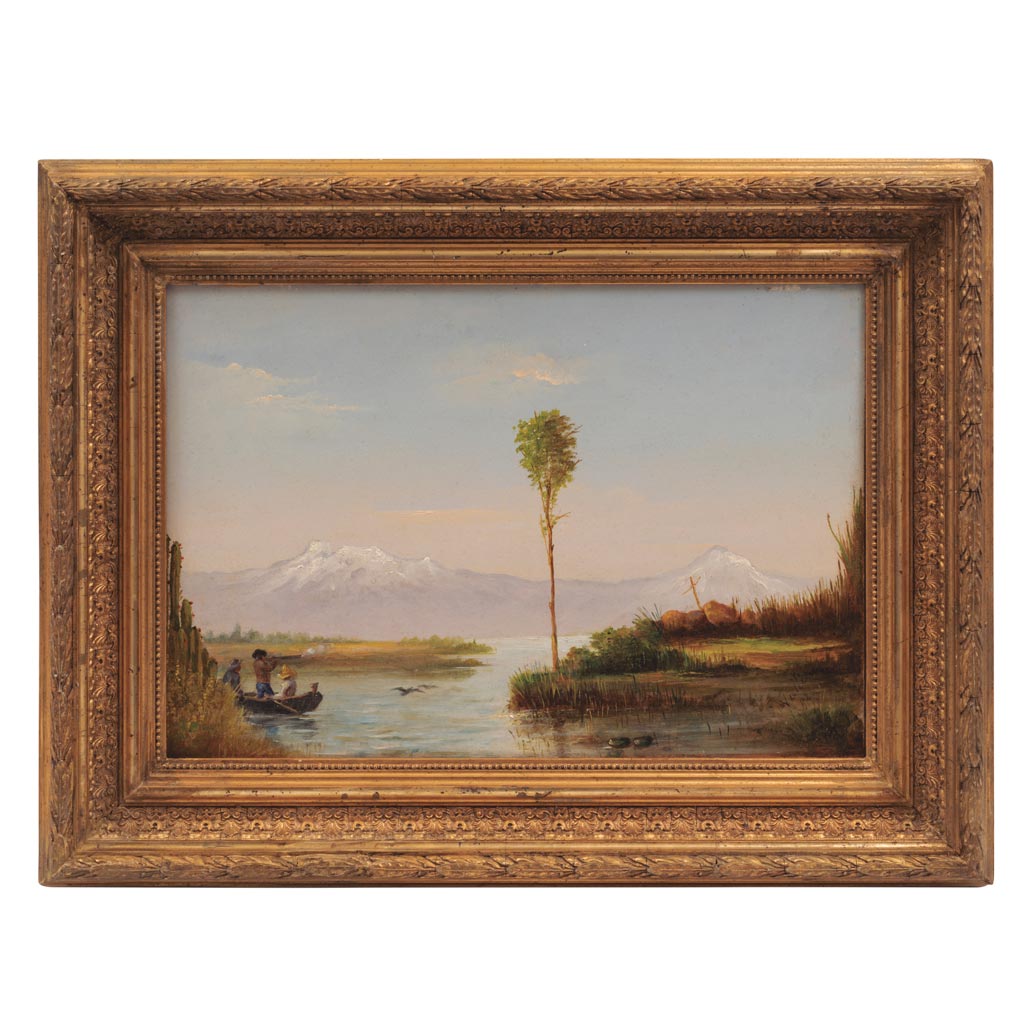 DANIEL DEL VALLE (MÉXICO, 1867-1935) CAZADORES EN XOCHIMILCO, CON PAISAJE DE LOS VOLCANES