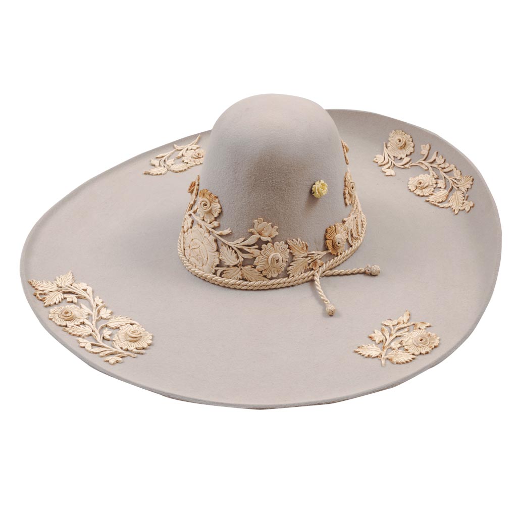 Subasta 880, Lote # 302 SOMBRERO CHARRO ANTIGUO MÉXICO, CA. 1920 En fieltro fino con ornatos y rositas de cuero de pial calados y chapetas de marfil. Detalles de conservación y restauración. Estimado $6,000-10,000