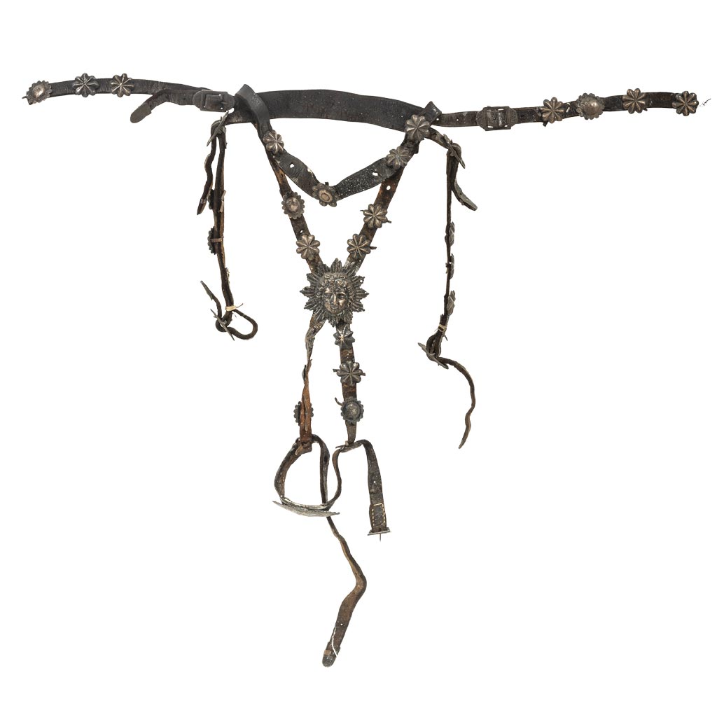 Elaborada en cuero y metal plateado, decorada con motivos florales y un mascarón rodeado de un resplandor al centro. Detalles de conservación y estructura. Estimado $5,000-6,000