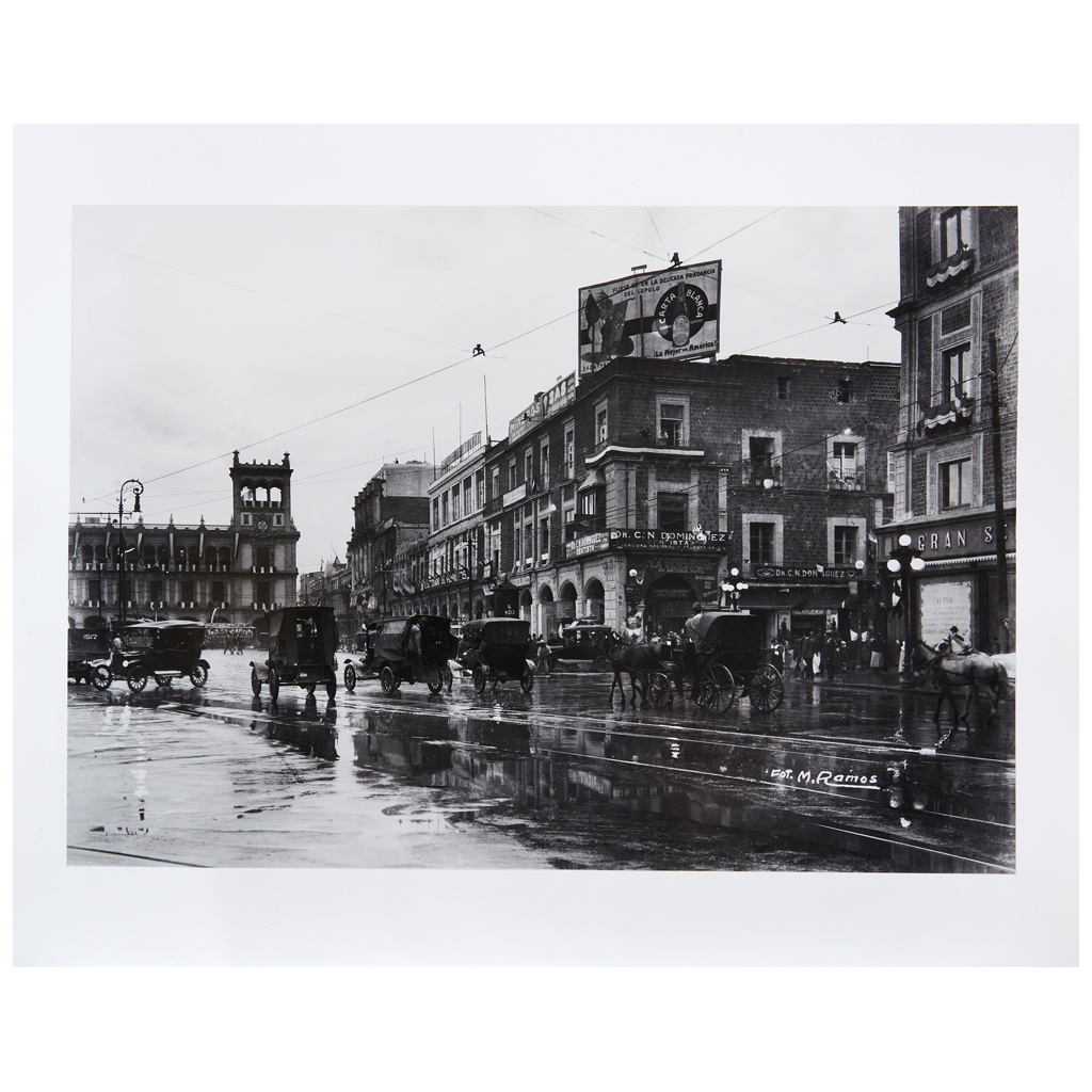 Subasta 885, Lote # 275 MANUEL RAMOS (Venado, San Luis Potosí, 1874 - Ciudad de México, 1945) Tráfico de carruajes y automóviles en una de las calles aledañas al zócalo de la Ciudad de México Firmada desde negativo original Plata sobre gelatina a partir del negativo original Con certificado de autenticidad del Archivo Fotográfico Manuel Ramos firmado por Elia del Carmen Ramírez Bocardo, directora general, 2018. Publicada en: RAMÍREZ BOCARDO, Elia del Carmen. Manuel Ramos. Fervores y epifanías en el México moderno. México. Archivo Fotográfico Manuel Ramos, FONCA, 2011, Pág. 91. "Su cámara conoció de las violentas o pacíficas sucesiones presidenciales que se dieron entre el gobierno de Díaz y del general Álvaro Obregón. Retrató el Zócalo capitalino luego de haber sido escenario de las batallas de la Decena Trágica y cuando se llenó de los vítores a favor de Francisco I. Madero, Francisco Villa y Emiliano Zapata". Alfonso Morales. Fuente consultada: RAMÍREZ BOCARDO, Elia del Carmen y MORALES, Alfonso. Manuel Ramos. Fervores y epifanías en el México moderno. México. Archivo Fotográfico Manuel Ramos, FONCA, 2011, Pág. 58. 31 x 44 cm / 12.2 x 17.3 pulgadas Estimado $55,000-70,000