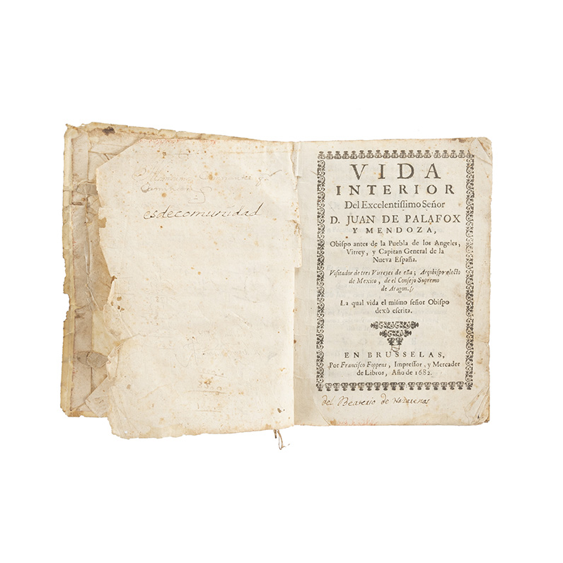 Subasta 1004, Lote # 154 Palafox y Mendoza, Juan de. Vida Interior del Excelentíssimo Señor Obispo, Antes de la Puebla de los Ángeles, Virrey y Capitán General de la Nueva España. Visitador de Tres Virreyes de Ella; Arzobispo Electo de Mégico de el Consejo Supremo de Aragón. La Cual Vida el Mismo Señor Obispo Dejó Escrita. Bruselas: Por Francisco Foppens., Impressor y Mercader de Libros, 1682. 8o. marquilla, 5 h. + 404 p. Pastas por desprenderse y sin lomo. Desde la portada, hasta la página 5 y páginas 399 - 404 con rasgaduras. Encuadernado en pergamino. "Vida Interior de un Pecador Arrepentido", autobiografía de uno de los más influyentes religiosos novohispanos del Siglo XVII, Juan de Palafox y Mendoza gran impulsor de la cultura y la educación; fundó numerosos colegios, apoyó las artes y creó la Biblioteca Palafoxiana y Virrey de la Nueva España en 1642. Estimado $20,000-24,000