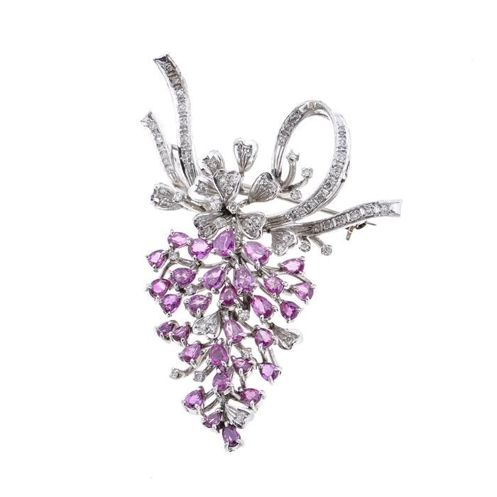 Subasta 988T, Lote # 189 Prendedor con rubíes y diamantes en plata pladio. 28 rubíes corte gota. 2.80ct. 47 ascentos de diamantes. Peso: 21.3g. Estimado $6,000-8,000