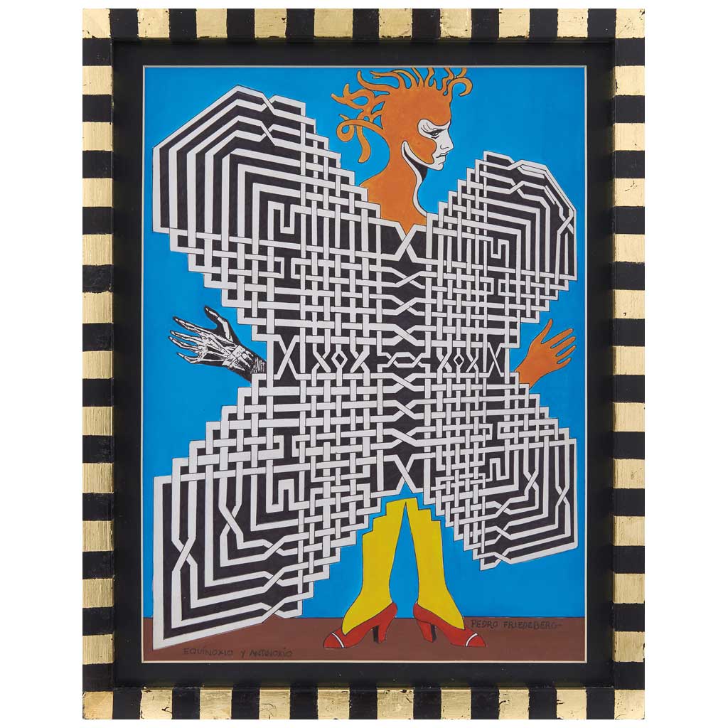 Subasta 916, Lote # 195 PEDRO FRIEDEBERG (Florencia, Italia, 1936 - ) Equinoxio y Antinoxio, 2014 Firmado Acrílico y tinta sobre papel Con certificado de autenticidad del artista, julio del 2017. El marco es parte de la obra. "Aunque la pertenencia de Friedeberg al surrealismo haya sido certificada por André Breton, lo más seguro es que su obra gravita en ese mencionado tercer plano que guarda imprudente distancia de cualquier tendencia en que se le encasille. Así como sus disociaciones deliberadas entre obra, título y significado, Friedeberg se disoció de la historia del arte del siglo XX, de la misma manera que un juego infantil prescinde de la lógica, porque él es un caso aparte, pese a que su obra sea legible a partir de muchos de los principios del surrealismo". Luis Carlos Emerich. Fuente consultada: HOLTZ, Déborah et ál. Pedro Friedeberg. México. Trilce Ediciones, 2009, pp. 31 y 42. Derechos Reservados © Pedro Friedeberg. 46.6 x 37 cm medidas totales con marco USD $3,350-$4,450 Estimado $60,000-80,000