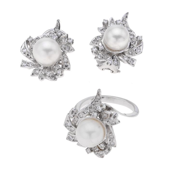 Anillo y par de aretes en plata paladio con 3 perlas y diamantes. 3 perlas cultivadas de 9 mm color blanco. 69 ascentos de diamantes. Talla: 5 12 anillo . Peso: 19.4 g.