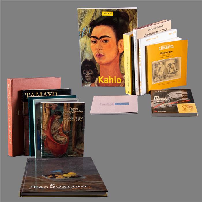 Subasta 0002L, Lote # 39 LOTE DE LIBROS DE ARTE. Rivera, Diego / García Barragán, Elisa / Chavez Morado, José / Pitol, Sergio / Kettenmann, Andrea / O´Higgins, Pablo / A. Kaplan, Janet / Estrada, Agustín / Taracena, Bertha / Aalto, Alvar / Mejía Prieto, Jorge / Corredor Matheos, J. a) Diego Rivera. Pintura de Caballete y Dibujos.México: Editorial de la Plástica Mexicana, 1979. 209 p. Con ilustraciones en color. Encuadernado en pasta dura. b) García Barragán, Elisa. Cordelia Urueta y el Color. México: UNAM, 1985. 84 P. + láminas en color y blanco y negro. Encuadernado en pasta dura. c) Chavez Morado, José. Apuntes de mi Libreta. México: Ediciones de Cultura Popular, 1979. 293 p. Con ilustraciones. Encuadernado en rústica. d) Pitol, Sergio.Juan Soriano. México: Ediciones ERA, 1993. 177 p. Con ilustraciones en color. Encuadernado en pasta dura. e) Kettenmann, Andrea. Frida Khalo. México: TASCHEN, 1992. 96 p. Con ilustraciones en color. Encuadernado en rústica. f) O´Higgins, Pablo. Apuntes y Dibujos de Trabajadores. México: 1987. 268 p. + láminas Textos por Alberto Híjar. Encuadernado en rústica. g) A. Kaplan, Janet.Viajes Inesperados. México: Ediciones Era, 1989. 272 p. Con ilustraciones intercaladas en el texto. Edición de 3,000 ejemplares. Encuadernado en rústica. h) Estrada, Agustin.La Puerta de Palo. México, 1998. 61 p. Encuadernado en rústica. i) Taracena, Bertha. Alfredo Zalce. México: UNAM, 1984. 93 p. Ilustrado. Encuadernado en rústica. j) Estrada, Agustin. Diario Imaginario. México: 1996. 45 p. Edición de 300 ejemplares, ejemplar 173. Encuadernado en rústica. k) Alvar Aalto. Helsinki, 1988. 167 p. Encuadernado en rústica. l) Mejía Prieto, Jorge. En torno a Cuevas. México: Panorama Editorial, 1985. 181 p. Encuadernado en rústica. m) Corredor Matheos, J. Tamayo. Barcelona: Ediciones Polígrafa, 1987. 128 p. Ilustrado con láminas en color. Encuadernado en pasta dura. ñ) Hernández Campos, Jorge.Diego Rivera los años Cubistas. México: Instituto Nacional de Bellas Artes, 1984. 144 p. Ilustrado. Encuadernado en rústica. Total de piezas: 14. Estimado $600-800