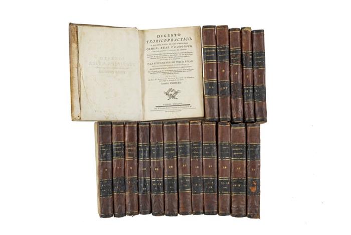Subasta 925, Lote # 229 BB - Rodríguez de Fonseca, Bartolomé Agustín. Digesto Teórico Práctico o Recopilación de los Derechos Comun, Real y Canónico por los Libros y Títulos del Digesto. Madrid: Por D. Joachin Ibarra Impresor de Cámara de S. M. / En la Imprenta Real, 1775 - 1791. 4o. marquilla. Traducción literal al Castellano de todas las leyes y párrafos del Digesto, expresión de sus concordantes y discordantes con las del Código, Derecho Real de España e Indias, y Catítulos Canónicos, por el orden de antigüedad: Y las Exposiciones de todas Ellas, hasta las nuevamente recopiladas en el año de 1773, con sus derogaciones, correcciones y ampliaciones. Obra útil para el uso de todos los facultativos, para los Jueces que no son Juristas, para Eclesiásticos y Religiosos, y todas las personas que deséen instruirse en las materia del Derecho. Tomo Primero: XI + 429 p. Tomo Segundo: VI + 445 p. Páginas 247 - 272, surcos de polilla en margen externo, no afecta texto. Páginas 273 - 306, surco de polilla tercio inferior de margen externo, afecta poco el texto. Tmo Tercero: X + 459 p. Tomo Quarto: IV + 487 p. Tomo Quinto: IV + 410 p . Tomo Sexto: IV + 451 p. Tomo Séptimo: IV + 467 p. Tomo Octavo: IV + 454 p. Tomo Nono: IV + 479 p. Páginas 421 - 479 con surcos de polilla en punta superior, no afecta texto. Tomo Décimo: IV - 402. Ejemplar con mancha de humedad en margen interno. Tomo Undécimo: II + 472 p. Páginas 55 - 276, punto de polilla en margen superior; 277 - 342, punto y surco de polilla, afecta texto. Tomo Duodécimo: IV + 493. Punos y surcos de polilla en tercio inferior de margen interno, afecta poco el texto. Tomo XIII: IV - 443 p. Tomo IV : II + 431 p. Tomo XV: VIII - 534 p. Tomo XVI: IV + 441 p. Tomo XVII: IV + 550 p. Tomo XVIII: IV + 460. Desde portada y hasta la página 26, punta inferior roída. Encuadernados en pergamino, lomo en piel. Piezas: 18. Estimado $32,000-36,000