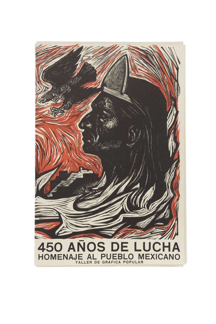 Subasta 925, Lote # 269 KA - Taller de Gráfica Popular. 450 Años de Lucha, Homenaje al Pueblo Mexicano. 146 Estampas de Lucha del Pueblo Mexicano. México: Taller de Gráfica Popular, 1960. fo. marquilla, 8 p. + 143 láminas numeradas del 0 al 140 (127b, 133b y 136b), Obra colectiva de los artistas del Taller de Gráfica Popular en México. Índice de los grabados con notas históricas, prólogo y declaración de principios del Taller de Gráfica Popular. "En la compaginación de esta obra seleccionamos los grabados originales del álbum de "Estampas de la Revolución Mexicana", edición de la "Estampa Mexicana", publicada en el año 1947, por considerarlos fiel reflejo temático y una buena realización plástica.". En carpeta. Estimado $8,000-10,000