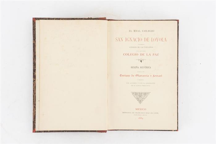 4o. marquilla, 7 h. + 244 + 130 p. + 1 h. Diez láminas y croquis plegado "Croquis de las plantas baja y alta del Colegio de San Ignacio o de La Paz". Dedicado y firmado por el autor. Encuadernado en pasta dura, lomo en piel.