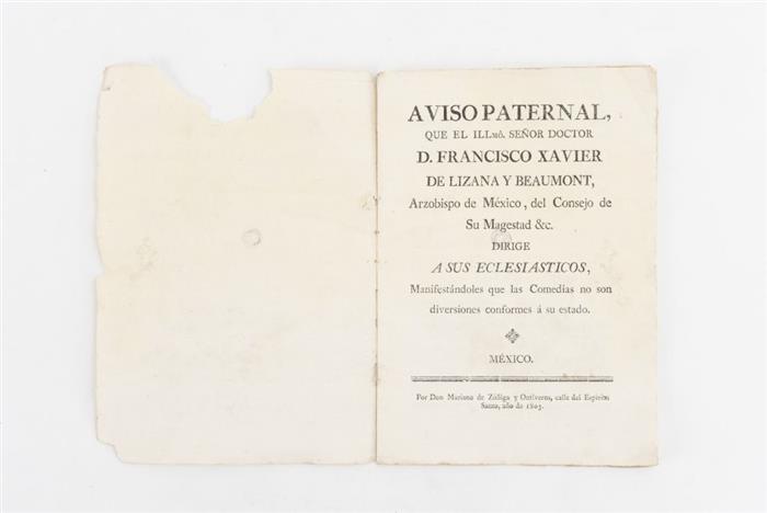 AC1803 - Lizana y Beaumont, Francisco Xavier.Aviso Paternal… Dirige a sus Eclesiásticos, Manifestandoles que las Comedias no son Diversiones Conformes a su Estado. México: Por Don Mariano de Zúñiga y Ontiveros, 1803. 8o. marquilla, 19 p. Pasta anterior con faltante en parte superior; última hoja con pequeños faltantes. Cosido, pastas en rústica.