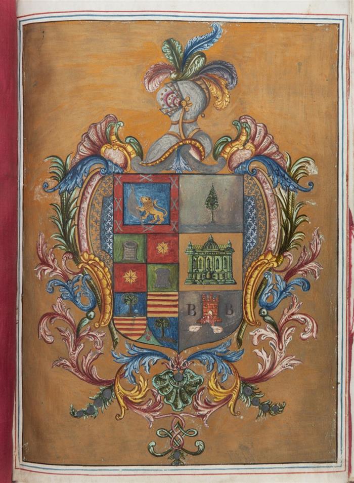 Manuscrito en vitela con tres pinturas: Escudo de Armas, Alegoria y Árbo Genealógico. Seis Escudos de Armas intercalados en el texto, viñetas y letras capitulares. 4o. marquilla 24 hojas. Encuadernado en pasta dura, en piel.