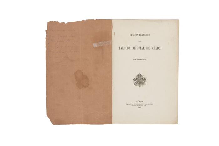 Subasta 925, Lote # 121 1865 - Zorrilla, José. Función Dramática en el Palacio Imperial de México el 4 de Noviembre de 1865. México: Imprenta de Andrade y Escalante, 1865. 4o. marquilla, 16 p. Lomo restaurado y faltantes, pastas manchadas y faltantes y texto con manchas de óxido en últimas hojas. Encuadernado en rústica. Composición en verso escrita por José Zorrilla dedicada al Emperador Maximiliano en ocasión a la inauguración del Teatro Nacional de México. "S. M. el Emperador Maximiliano de México, dirigió con fecha 12 de Octubre una carta á su Ministro de Gobernación, el Sr. Esteva, manifestándole su propósito de crear en esta Corte un Teatro Nacional, donde se representarán obras dramáticas bajo la dirección del célebre poeta D. José Zorrilla… Dispuso también S. M. que para inagurar provisionalmente el Teatro Nacional de México, se diera en la Corte una función dramática el 4 de Noviembre, día del Santo patrono de la Emperatriz…". Estimado $10,000-12,000