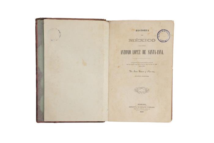 Subasta 925, Lote # 210 APA - Suárez y Navarro, Juan. Historia de México y del General Antonio López de Santa Anna. Comprende los Acontecimientos Políticos que han Tenido Lugar en la Nación desde el Año de 1821 Hasta 1848. México: Imprenta de Ignacio Cumplido, 1850. 4o. marquilla, XI + 457 p. Retrato de Antonio López de Santa Anna, firmado L. Audibert, litografía de Cumplido, con manchas de humedad. Error de paginación. Pastas y lomo gastados, pastas con manchas de humedad y pie deteriorado. Encuadernado en pasta dura, lomo en piel. Palau: 324012. Menciona tomo I: En página 457 "Fin del tomo primero. No se publicó más". Apología de Santa Anna y del ejército mexicano. Historia política detallada y muy útil para el período 1821 - 1833. Aunque el autor se proponía llevar la narración hasta 1848, se detiene abruptamente en 1833. Historia de los primeros años de México independiente, incluyendo el Imperio de Agustín de Iturbide y las subsiguientes guerras internas. También incluye noticias sobre los principios de la guerra contra los texanos. Estimado $12,000-15,000
