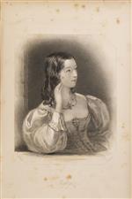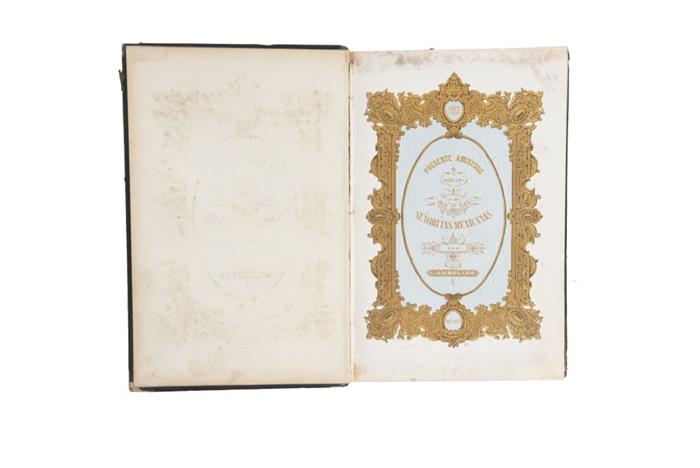 Subasta 925, Lote # 239 DA - Cumplido, Ignacio. Presente Amistoso Dedicado a las Señoritas Mexicanas. México: Ignacio Cumplido, 1852. 4o. marquilla, III + 439 p. + 2 h. Frontispicio (cromolitografía) + 20 láminas. Textos por: Francisco Zarco, Francisco Granados Maldonado, Emilio Rey, Félix María Escalante, Fernando Orozco y Berra, José T. de Cuéllar, Guillermo Prieto, Francisco González Bocanegra (Autor de los versos del himno nacional mexicano), entre otros. Cajos quebrados, sin cofia y sin pie. Encuadernación de lujo con decoraciones grabadas en dorado; lomo con título y hierros en dorados. Encuadernado en pasta dura, en piel. Obra consagrada como una ofrenda a la mujer mexicana, pretendía ilustrar al bello sexo con lecciones morales. Editado año con año por Ignacio Cumplido, reunía trabajos de algunos de los más reconocidos literatos mexicanos del momento. Bellamente ilustrada con 20 láminas finas mandadas a hacer por el editor a Londres, dibujadas por algunos de los mejores artistas y grabadores europeos de la época. "Yo creo que el PRESENTE DE 1852, tiene alguna superioridad sobre los que le han precedido, y deseo que él sea una muestra de que en México se hacen esfuerzos porque adelanten de consuno, la literatura y el maravilloso arte de la imprenta. Siendo esta de aquellas obras más esmeradas que salen de mi establecimiento, lo he dedicado a mis bellas y amables compatriotas…". Véase en: Prólogo. Estimado $24,000-28,000