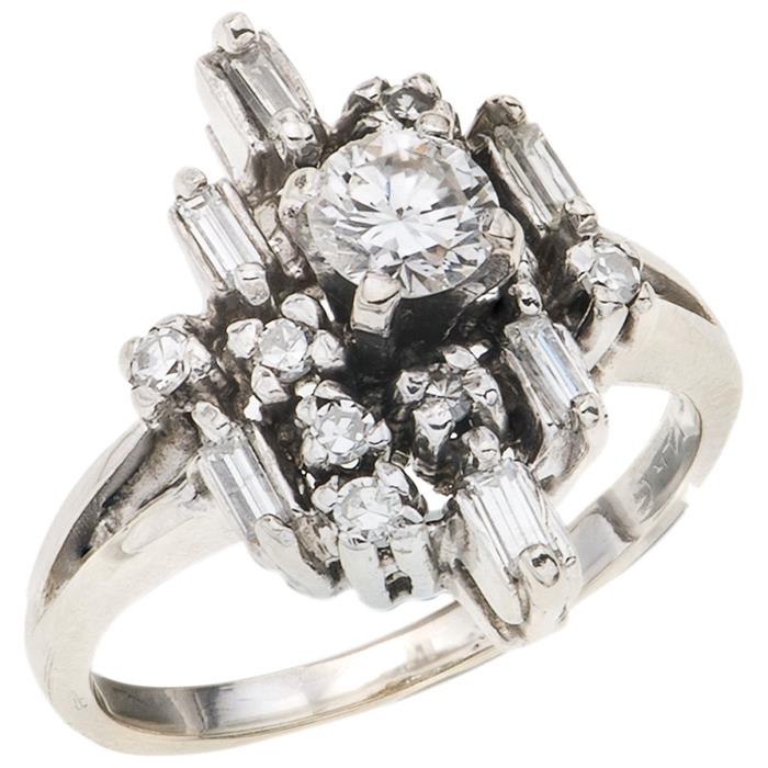 Subasta 0072M, Lote # 536 ANILLO CON DIAMANTES EN ORO BLANCO DE 14K Peso: 4.8 g. Talla: 5 1/2 1 Diamante corte brillante ~0.30 ct Claridad: SI1 Color: I 10 Diamantes corte 8x8 ~0.20 ct 6 Diamantes corte baguette ~0.25 ct Estimado $5,500-6,500