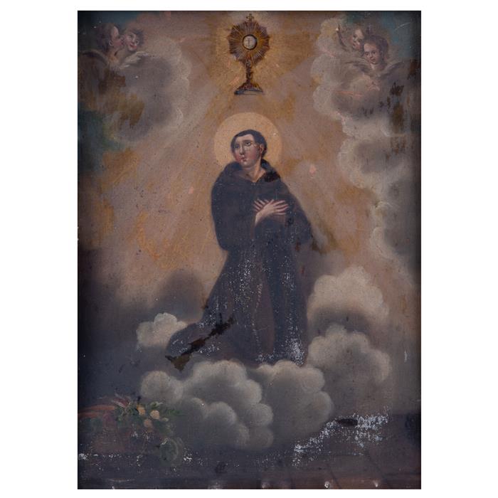Anónimo. México, finales del siglo XIX. Franciscano en ascenso, con custodia litúrgica, en rompimiento de gloria. Óleo sobre lámina. Detalles de conservación. 34 x 24 cm Estimado $2,500-4,000