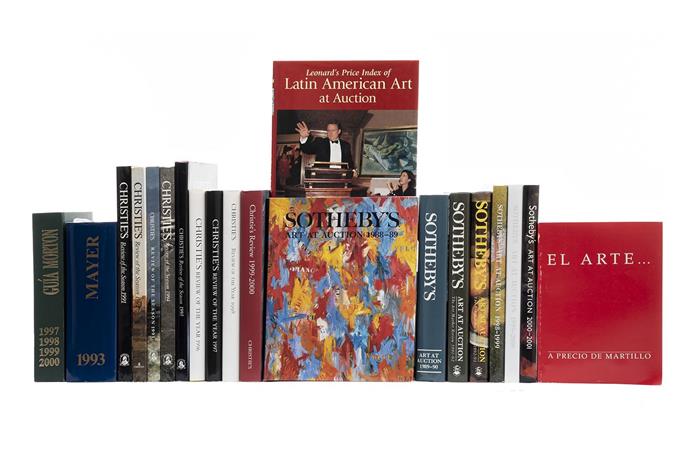 Subasta 936, Lote # 116 BD - Guías de Subastas de Arte. a) Christie's Review of the Year 1991-2000. London: Christie, Manson and Woods. 4o. marquilla, 339 p. +2 h; 309 p. +2 h; 309 p. +2 h; 309 p. +2 h; 229 p. +2 h; 266 p. +2 h; 256 p. +2 h; 256 p. +2 h; 344 p. +2 h. Encuadernados en rústica y pasta dura. b) Sotheby's: Art at Auction 1988-1993, 1998-2001. London: Sotheby's Publications. 4o. marquilla, 464; 464; 312; 312 p.; 192 p. +1 h; 192; 192 p. Volumen de los años 2000-2001. Incluye tarjeta con dedicatoria de Mallory Hathaway. Encuadernados en pasta dura. c) Guía Morton, años 1997-2000. México: Galerías Louis C. Morton, 2001. 4o. marquilla, 356 p. + 6 h. Primera edición. Edición de 500 ejemplares. Encuadernado en pasta dura. d) El Arte… A Precio de Martillo 1977 - 1995. Sin editorial, sin lugar de edición, sin año. 4o., 468 p. Encuadernado en rústica. e) Mayer: International Auction Records, 1993. Lausanne: Sylvio Acatos, 1993. 4o. marquilla, 129 p. Incluye un catálogo de libros de referencia y catálogos razonados. Encuadernado en pasta dura. f) Theran, Susan. Leonard's Price Index of Latin American Art at Auction. Massachusetts: Auction Index, 1999. 4o. marquilla, 537 p. + 7 h. Encuadernado en pasta dura. Total de piezas: 20. Estimado $1,500-2,000
