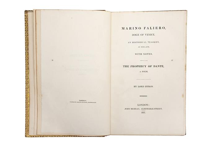 CB - Byron, Lord George Gordon .Marino Faliero, a Tragedy. The Prophecy of Dante, a Poem. London: John Murray, 1821. 8o. marquilla, 261 p. +1 h. Primera edición. Pasta anterior desprendida. Encuadernado en pasta dura, en piel.