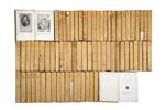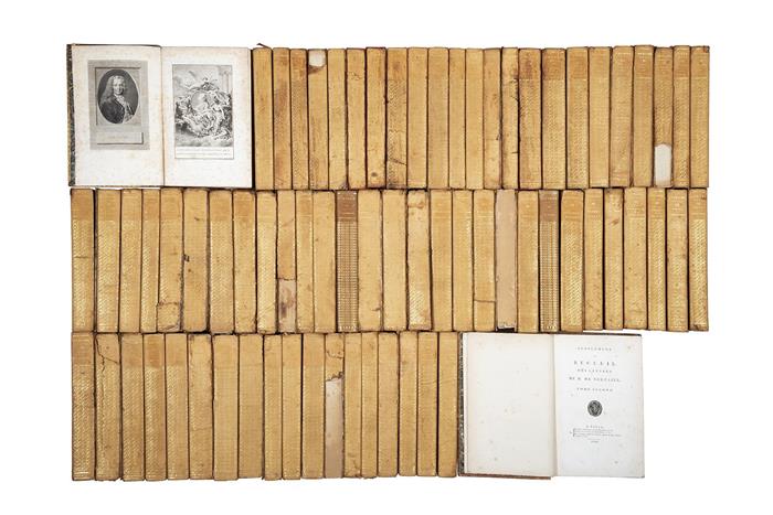 Subasta 936, Lote # 193 CC - Voltaire Œuvres Completes. Paris: Société Littéraire-Typographique, 1784, 1785, 1789, 1808. 4o. marquilla. Tomos I - LXX y Dos Tomos de Suplementos. Ilustrados con láminas de: J. M. Moreau le Jeune, De la Tour Pinx, Marie Anne Loir, Amédé Van-Loo. Grabados por: J. B. Simonet, L. M. Halbou, J. A. Duclos, A. Romanet, Dambrun, Ph. Triere, A. J. Duclos, De Launay, De Longueil, L. Balbou, J. L. Delignon, Lemire, Le Veau, d'Embrun, L. J. Masquelier. J. C. Guttemberg, Helman, N. F. Maviez, J. B. Fosseyeux, Beisson, Baquoy, L. Creutelle, Linger, P. G. Langlois, Alex Tardieu. Tomo XXXI: 14 láminas. Tomos V y XXIX: Faltante en lomo. Tomos VI, XII, XLVII y LXVIII: Pasta anterior desprendida. Tomos VII, IX, XXI, XXII, XLIII y LIX: Lomo desprendido. Tomos XIV, XXV, XXXIII, XXXIV, XXXIX, XL, XLII, XLV, LIV, LXI y LXXII: Pasta anterior y lomo desprendidos. Tomo XV: Pasta posterior y lomo desprendidos. Tomo XVI: Hoja rasgada. Tomos XX, XXX, XXXI, XXXVI, XXXVIII, XLIV, LV y LXV: Pastas y lomo desprendidos. Tomo XXIV: Páginas 16, 17, 51 y 257 rasgadas. Tomo LIV: Página 535 rota. Tomo LX: Pasta posterior desprendida. Encuadernado en pasta dura, en piel. Piezas: 72. Provenance: Subasta Christie's 1998. Estimado $60,000-80,000