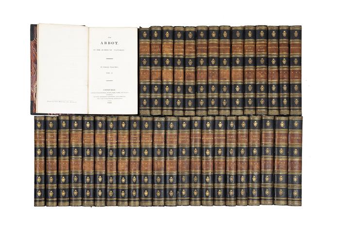 Subasta 936, Lote # 179 CB - Scott, Walter. The Antiquary / Heart of Mid - Lothian / Ivanhoe / The Monastery / The Abbot / Kenilworth / The Pirate / Fortunes of Nigel / Quentin Durward / Redgauntlet / St. Ronan's Well / Woodstock. a) Scott, Walter. The Antiquary. Edinburgh: Archibald Constable, 1816. 8o. marquilla, 336; 348; 372 p. Tomos I - III. Encuadernados en pasta dura, lomos y puntas en piel. Piezas: 3. b) Heart of Mid - Lothian. Edinburgh: Archibald Constable, 1818. 8o. marquilla, 333; 322; 375; 328 p. Tomos I - IV. Tomo I: Faltantes en páginas 65 y 67, afectan poco texto. Encuadernados en pasta dura, lomos y puntas en piel. Piezas: 4. c) Ivanhoe. Edinburgh: Archibald Constable, 1820. 8o. marquilla, 298; 327; 371 p. Tomos I - III. Encuadernados en pasta dura, lomos y puntas en piel. Pieza: 3. d) The Monastery. Edinburgh: Archibald Constable, 1820. 8o. marquilla, 331; 333; 351 p. Tomos I - III. Encuadernado en pasta dura, lomos y puntas en piel. Piezas: 3. e) The Abbot. Edinburgh: Archibald Constable, 1820. 8o. marquilla, 348; 351; 367 p. + 1 h. Tomos I - III. Encuadernado en pasta dura, lomos y puntas en piel. Piezas: 3. f) Kenilworth. Edinburgh: Archibald Constable, 1821. 8o. marquilla, 320; 339; 348 p. Tomos I - III. Encuadernado en pasta dura, lomos y puntas en piel. Piezas: 3. g) The Pirate. Edinburgh: Archibald Constable, 1822. 8o. marquilla, 322; 332; 346 p. Tomos I - III. Encuadernado en pasta dura, lomos y puntas en piel. Piezas: 3. h) Fortunes of Nigel. Edinburgh: Archibald Constable, 1822. 8o. marquilla, 313; 334; 349 p. Tomos I - III. Encuadernado en pasta dura, lomos y puntas en piel. Piezas: 3. i) Quentin Durward. Edinburgh: Archibald Constable, 1823. 8o. marquilla, 273; 331; 360 p. Tomos I - III. Encuadernados en pasta dura, lomos y puntas en piel. Piezas: 3. j) Redgauntlet. Edinburgh: Archibald Constable, 1824. 8o. marquilla, 319; 328; 319 p. Tomos I - III. Encuadernados en pasta dura, lomos y puntas en piel. Piezas: 3. k) St. Ronan's Well. Edinburgh: Archibald Constable, 1824. 8o. marquilla, 310; 325; 323 p. Tomos I - III. Encuadernados en pasta dura, lomos y puntas en piel. Pieza: 3. l) Woodstock. Edinburgh: Archibald Constable, 1826. 8o. marquilla, 315; 332; 370 p. Tomos I - III. Encuadernados en pasta dura, lomos y puntas en piel. Piezas: 3. Total de piezas: 37. Provenance: Subasta Christie's 2001. Estimado $22,000-26,000