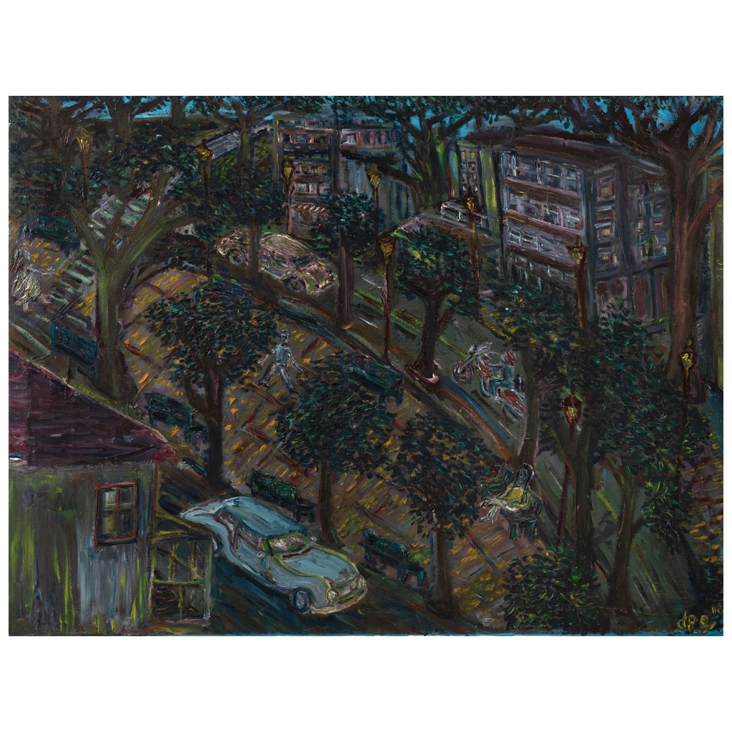 DARIEL PÉREZ GALLARDO (Buenavista, Cuba, 1984 - ) El paseo en Buenavista Firmado y fechado 18 al frente y al reverso Óleo sobre tela Con certificado de autenticidad del artista. La metodología con la que crea sus obras la llama "automatismo"; tirando pintura al azar sobre un lienzo o alguna otra superficie. Posteriormente revuelve todo con sus manos y comienza a formar figuras a partir de la primera idea que le surge. Abarca el espacio urbano en muchas de sus obras, con el objetivo de insinuarle al espectador las diversas lecturas desde una plataforma simbólica y poética, donde convergen la memoria colectiva y la concepción de lo real. El paseo en Buenavista surgió como una remembranza a lo que el artista veía en su camino al trabajo diariamente.
