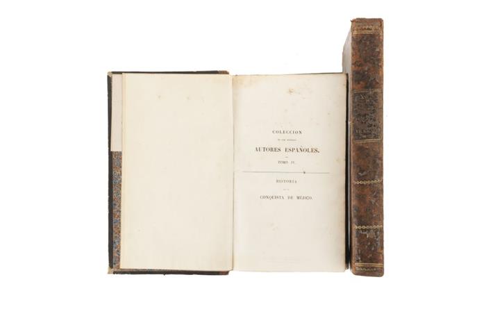 Subasta 947, Lote # 350 AC1521 - Solis, Antonio de / Clavijero, Francisco Javier. Historia de la Conquista de Méjico / Historia Antigua de Mejico. a) Solis, Antonio de. Historia de la Conquista de Méjico, Población y Progresos de la América Septentrional, Conocida por el Nombre de Nueva España. Paris: Baudry, Librería Europea, 1844. 8o. marquilla, VIII + 492 p. Colección de los mejores españoles. Tomo IV. Ex Libris de Carlos de Ovando. Frontispicio, grabado de Varin. Obra dividida en cinco libros. Manchas de óxido, afecta texto; páginas 381 - 384 restauradas y con rasgaduras en margen superior; página 481 con rasgadura en margen interno: puntas gastadas. Encuadernado en pasta dura, en piel. b) Clavijero, Francisco Javier. Historia Antigua de Mejico. Sacada de los Mejores Historiadores Españoles, y de Manuscritos y Pinturas Antiguas de los Indios. México: Imprenta de Juan R. Navarro, Editor, 1853. 4o. marquilla, X p. + 1 h. + 439 + V p. Dividida en diez libros. Adornada con cartas geográficas y litográficas; disertaciones sobre la tierra, animales y habitantes de México. Sello de antiguo propietario. 32 litografías de M. Murguia y un mapa. Manchas de humedad: gracias quebradas; puntos y surcos de polilla, afecta texto; última página mal numerada. Encuadernación partida. Encuadernado en pasta dura, en piel. Total de piezas: 2. Estimado $4,000-6,000