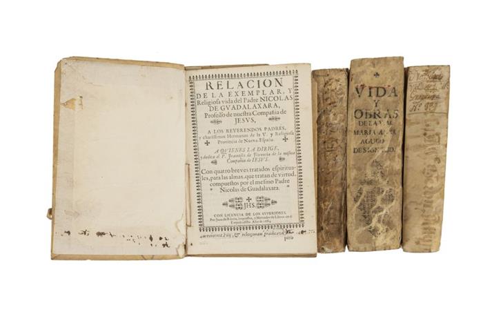 Subasta 947, Lote # 361 AC1758 - Alvarez de Abreu, Domingo Pantaleón / Florencia, Francisco de / Guadalaxara, Nicolas de / Santander y Torres, Sebastián / Letona, Bartholome de. Vida de la V. M. R. M. María Anna Agueda / Relación de la Exemplar, y Religiosa Vida del Padre Nicolas de Guadalaxara / Cvuatro Tratados / Vida de la Venerable Madre María de S. Joseph. a) Álvarez de Abreu, Domingo Pantaleón. Vida de la V. M. R. M. María Anna Agueda de S. Ignacio, Primera Priora del Religiosísimo Convento de Dominicas Recolectas de Santa Rosa de la Puebla de los Ángeles. México: Imprenta de la Biblioteca Mexicana, 1758. 8o. marquilla, 13 h. + 311 + 58 p. + 5 h. + 410 p. + 6 h. Marca de fuego del Convento de Guadalupe (Morelia, Michoacán) de la provincia de San Diego de México. Pastas y lomo por desprenderse; pasta anterior con faltante. Encuadernado en pergamino. b) Florencia, Francisco de. Relación de la Exemplar, y Religiosa Vida del Padre Nicolas de Guadalaxara, Proseiso de Nuestra Compañía de Jesvs. México: Juan de Ribera, 1684. 8o. marquilla, 3 h. + 32 fols. Portada sin margen inferior; surco y puntos de polilla, afecta muy poco texto. c) Guadalaxara, Nicolas de. Cvuatro Tratados qve Contienen Mvy Eficaces, Provechosas, Meditaciones, para Desarraygar Vicios, y Plantar Virtudes en las Almas que Professan la Vida Espiritual, y el Canmino de su Salvacion. Sin pie de imprenta. 8o. marquilla, 23 fols. + 1 h. (índice de los capítulos de la vida del P. Nicolas de Guadalaxara). Punto de polilla, afecta poco texto. Palau: 109274. En México, por Juan de Ribera, 1684. Publicado por el P. Francisco de Florencia. Incisos b y c encuadernados en un volumen. Encuadernado en pergamino. d) Santander y Torres, Sebastián. Vida de la Venerable Madre María de S. Joseph, Religiosa Augustina Recoleta, Fundadora en los Conventos de Santa Monica de la Ciudad de la Puebla, y después en el de la Soledad de Oaxaca. México: Herederos de la Viuda de Miguel de Rivera, 1723 8o. marquilla, 28 h. + 407 p. + 1 h. Retrato de la venerable madre María de S. Joseph, firmado en plancha Sylverio S. M. Ex Libris de Carlos de Ovando. Lomo con pequeños faltantes. Surcos y puntos de polilla, afecta poco texto; página 315 rasgada, afecta texto. Encuadernado en pergamino. e) Letona, Bartholome de. La Perfecta Religiosa. Puebla: Viuda de Juan de Borja, 1662. 8o. marquilla, 28 h. + 66 fols. + 67 - 104 p. + 105 - 164 fols. + 165 - 244 p. + 245 - 248 fols. + 249 - 389 p. + 3 h. Sin portada y faltan hojas en preliminares e índice. Encuadernado en pergamino. Total de piezas: 4. Estimado $7,000-9,000