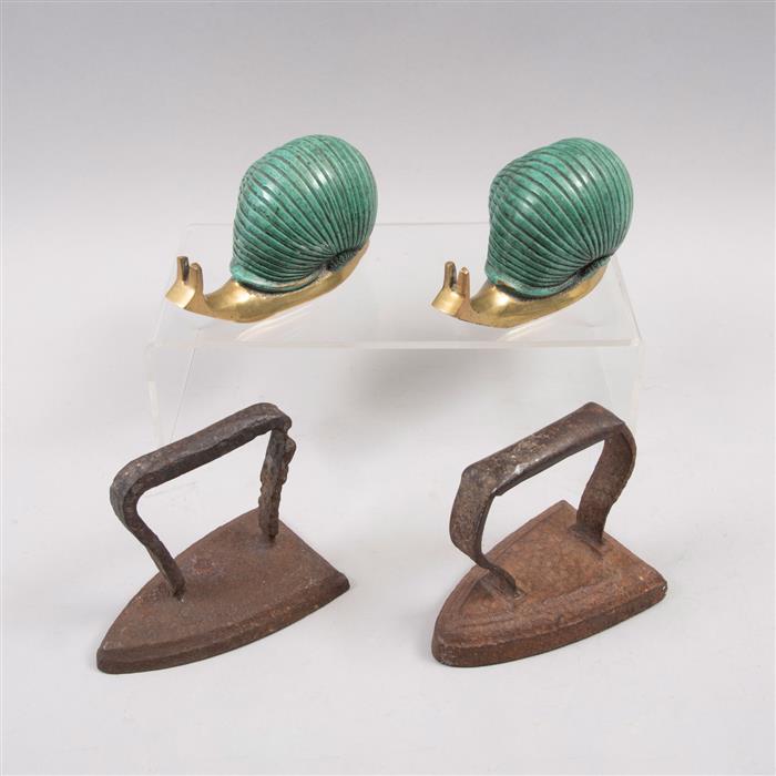 Par de caracoles en fundición de bronce patinado y 2 planchas de hierro de carbón.