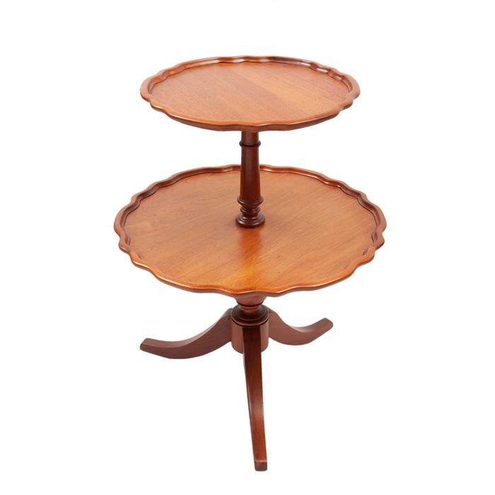 Cubiertas lobuladas con molduras, fuste balaustrado y soporte trípode.