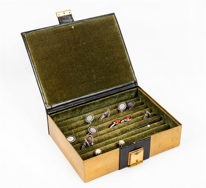 Lote de mancuernillas y ballenas. Siglo XX. Diferentes diseños. Elaboradas en metal plateado y plata. Con alhajero. Decoradas con simulantes de color. Presentan marcas, manchas, desgaste y faltantes. Total de piezas: 13 piezas. Estimado $1,000-2,000